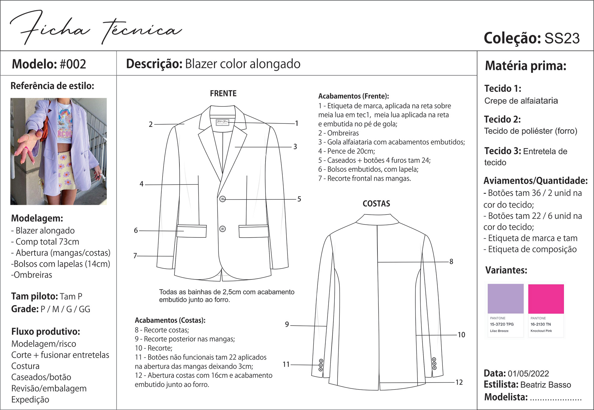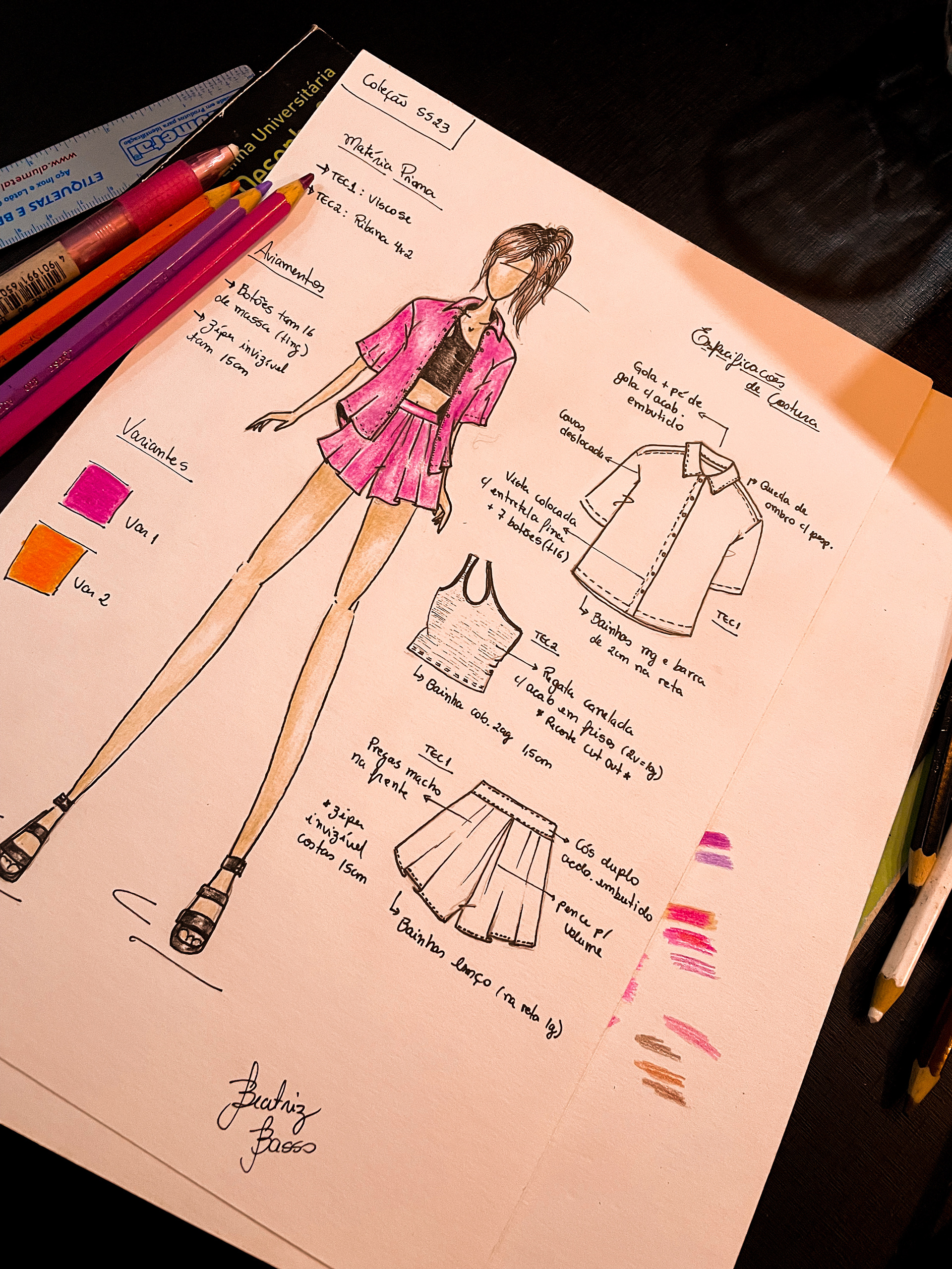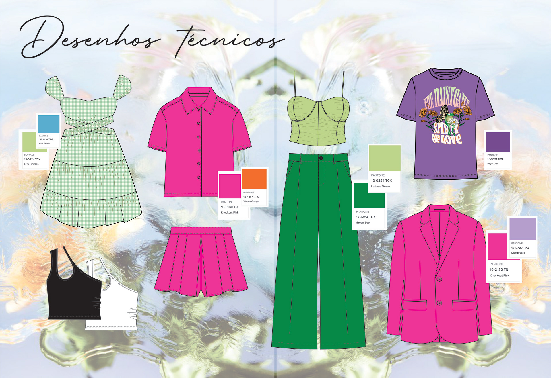 Coleção capsula com desenhos e ficha técnica de produto